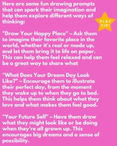 Drawing can also be a soothing way to cope with tough feelings, like when they’re feeling nervous or sad. It’s a personal tool they can always use to express themselves.