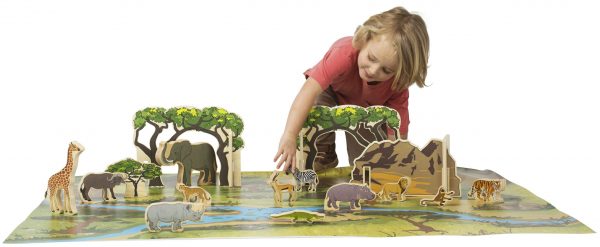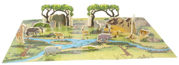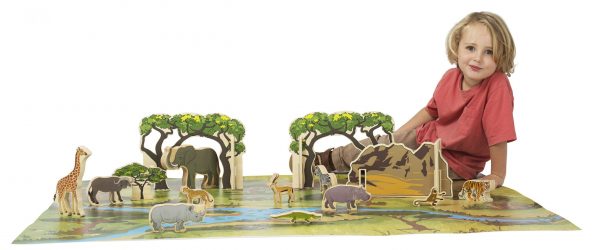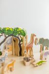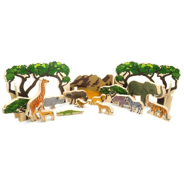 This high-quality wooden animal set includes mountains and trees brilliant for building your own wild playscape. The set comprises of 2 wooden arched trees, a mountain range, a wooden tree as well as 12 beautifully illustrated animals (Tiger, Lion, Zebra, Monkey, Crocodile, Giraffe, Gazelle, Buffalo, Elephant, Rhino, Leopard and Hippo). It is great playscape setup that encourages imaginative open-ended play while learning all about the wild animals and also promotes social development through role-playing. The beautifully illustrated images are printed using non-toxic heat transfer technology and sealed with a clear matte varnish to ensure long-lasting quality.