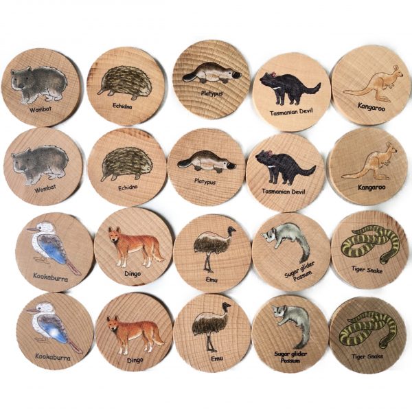 Australian Animals Matching Pairs (20 Pieces) A perfect game for both young and old is the Australian Animals Matching Pairs set. Featuring all your favourite Australian animals such as the wombat, emu, platypus and so many more, these discs are great for learning about native Australian animals, as well as a fun game of matching pairs.