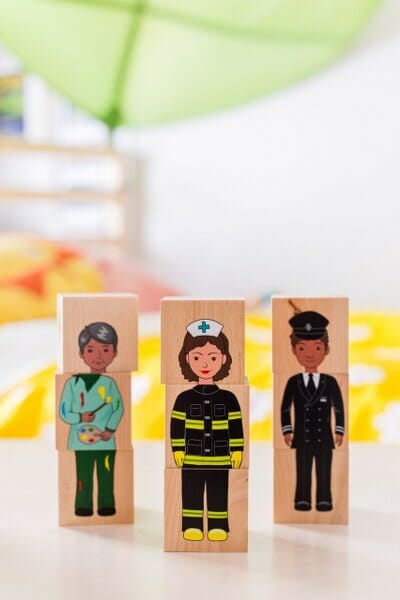 Mix and Match a cross-section of people from a range of ethnic backgrounds and professions found in our community. This 12 piece block set represents 16 different occupations found in our community, ranging from a female judge, an African American astronaut to a western construction worker. These wooden blocks are hours of fun while supporting children to develop a sense of identity by learning about the different people and roles that make up our community. A great toy for developing motor skills by stacking, balancing and matching blocks.