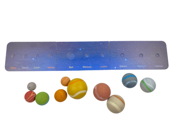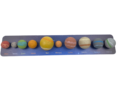 Consisting of the Sun and Moon, as well as Mercury, Venus, Earth, Mars, Jupiter, Saturn, Uranus, Neptune all planets are hand painted in colours to match the planet names on the wooden board.