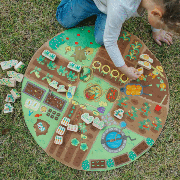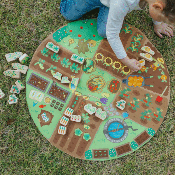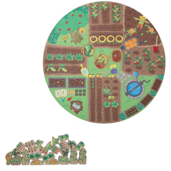 Children can “plant” and “pick” bright wooden vegetables—from carrots and pumpkins to leafy greens—enhancing their understanding of how gardens grow. The garden mat provides a visual and tactile foundation for storytelling, sorting, role play, and cooperative activities.