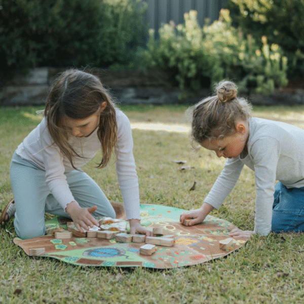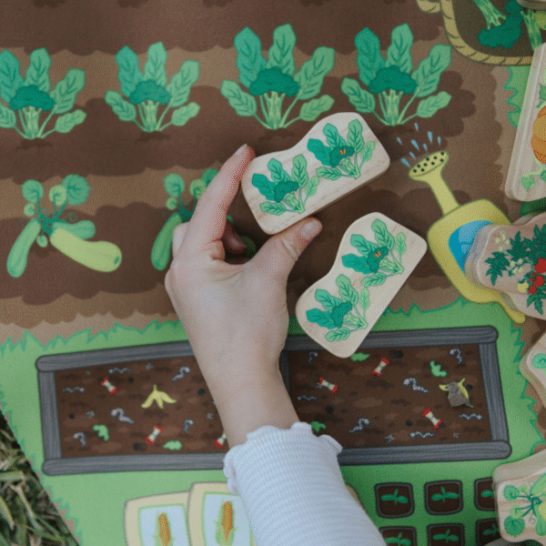 The Garden Grow & Gather set includes 24 beautifully crafted wooden vegetable pieces and a soft microsuede rubber-backed mat, featuring a vibrant garden scene. This open-ended resource encourages children to engage in pretend play, practice fine motor skills, and learn about healthy foods and nature.