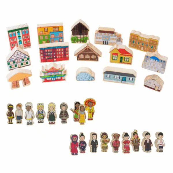 This multicultural collection includes two thoughtfully crafted sets: Homes Around the World and Children of the World. Together, they offer a rich, hands-on way for children to explore cultural diversity through open-ended play.