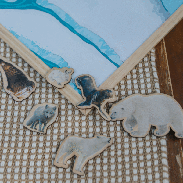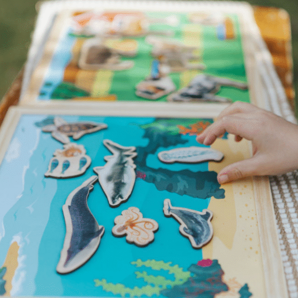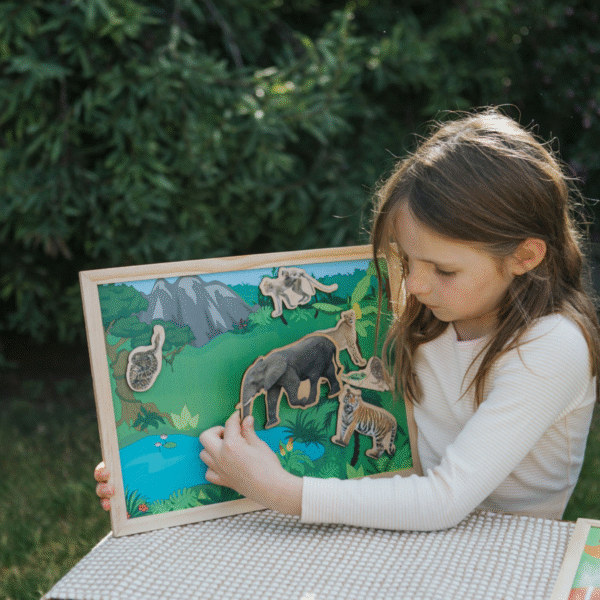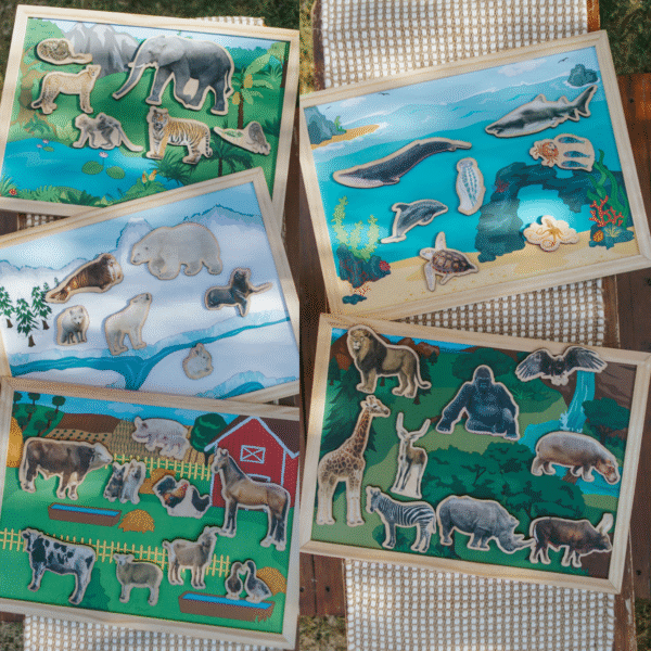 Featuring 5 beautifully illustrated, magnetic scenes in nature —Ocean, Jungle, Savanna, Arctic, and Farm—and 40 magnetic animal pieces, children can explore the natural world while building their understanding of ecosystems, animal types, and geography through hands-on play.