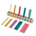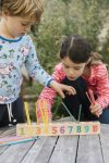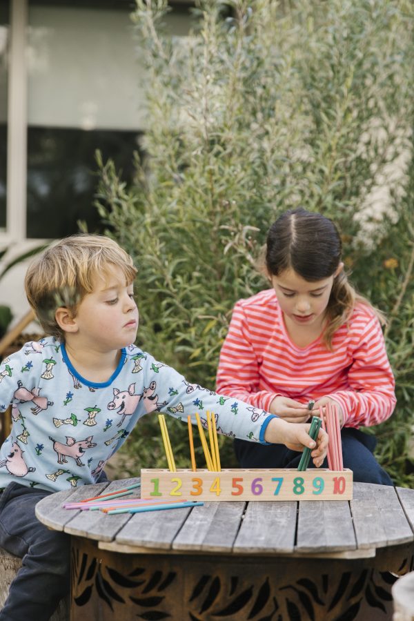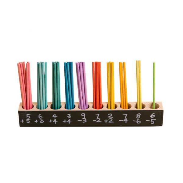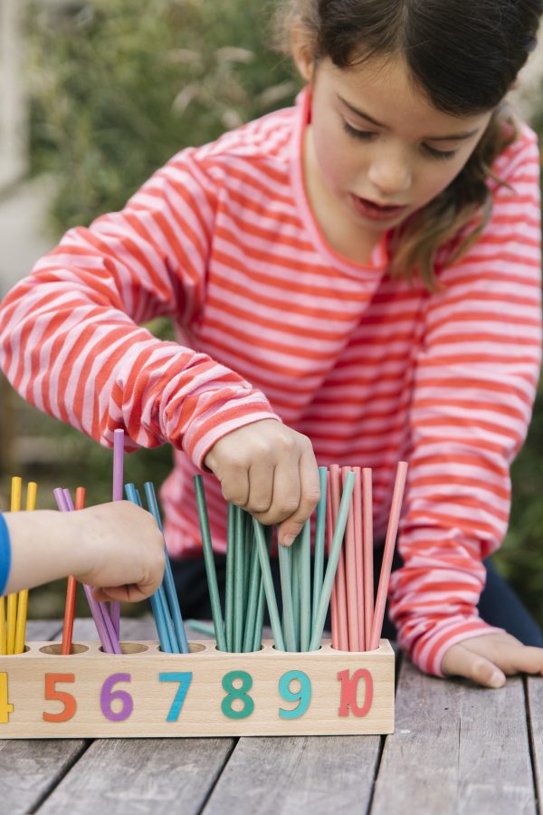 Let’s count from one to ten. Using sticks to practice counting is a tried and true method. It’s re-imagined here with this early counting device in beautiful vibrant colours with a blackboard to aid written skills.