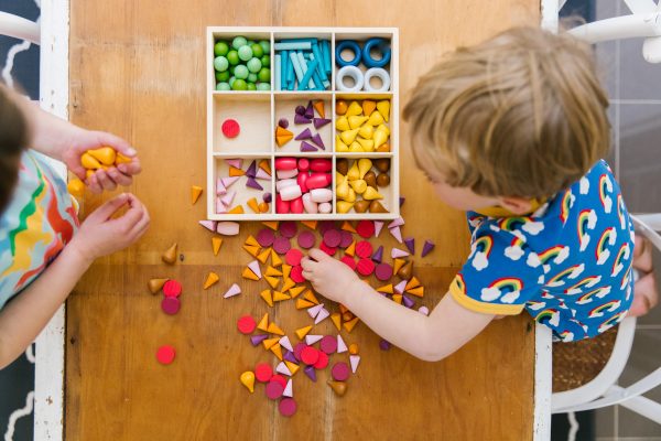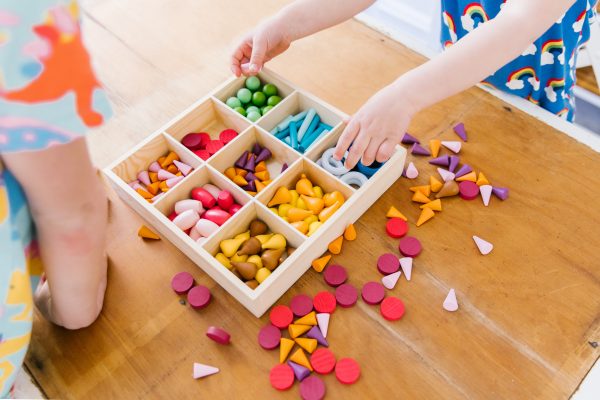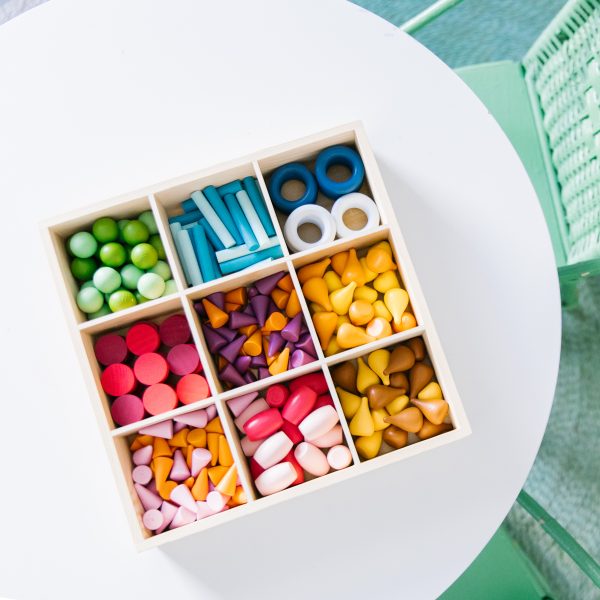 Looking for a toy that is completely open-ended, encourages mindfulness, and is perfect on its own but also combines beautifully with other toys? If you answered ‘yes’, then this is for you. Made up of high quality, wooden cones, rods, rings, balls, and other small shapes, painted in a range of beautifully contrasting colours, this set can be used for pattern making, colour and shape sorting, or as props in imaginary small worlds for play.
