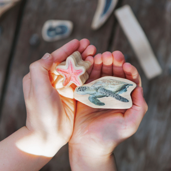 Wooden marine animals including jellyfish, sea turtles, whales, coral, and starfish. Encourages curiosity about ocean life and environmental awareness.